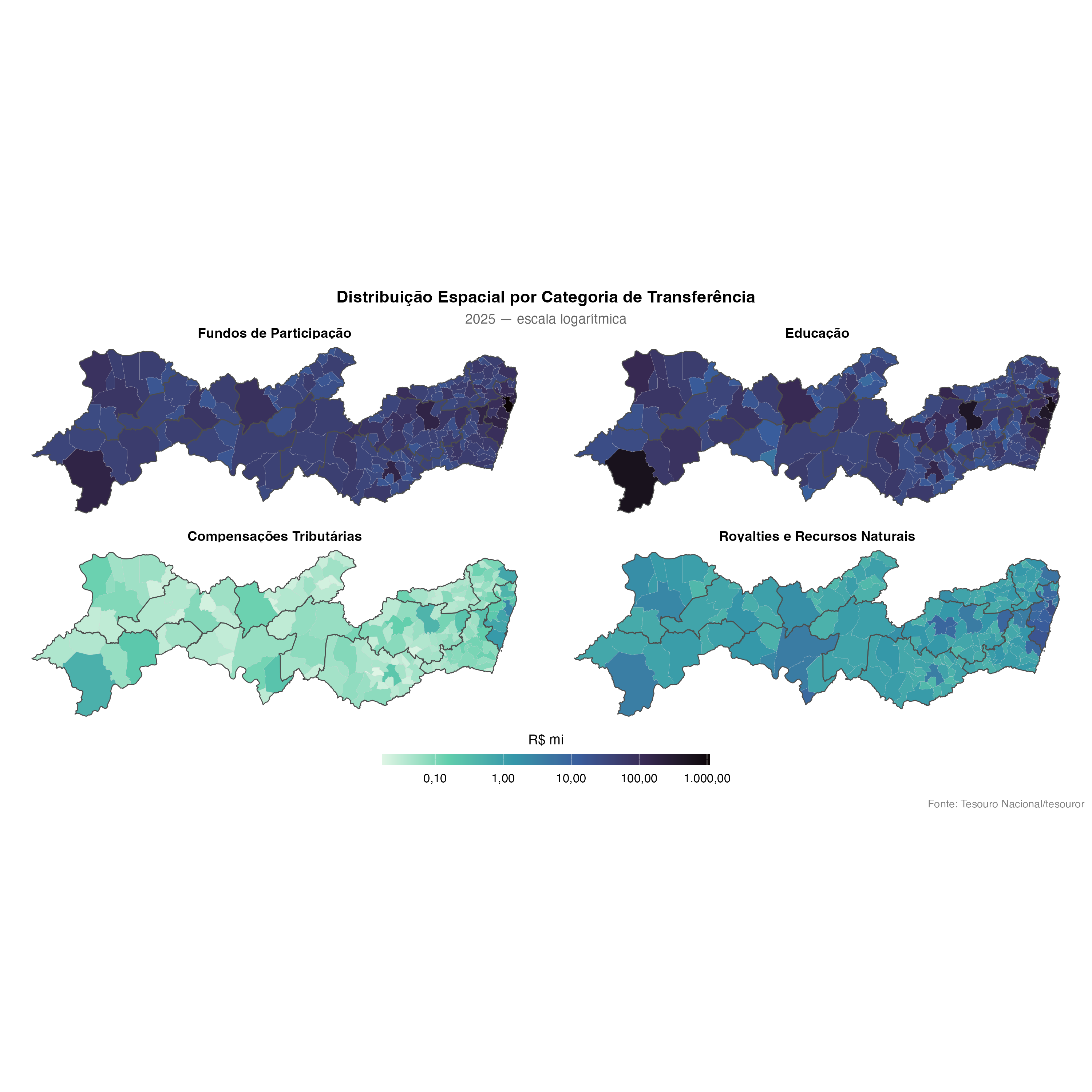 Cada painel mostra a distribuição espacial de uma das 5 categorias. Note como os Royalties se concentram em poucos municípios, enquanto o FPM tem distribuição mais homogênea.